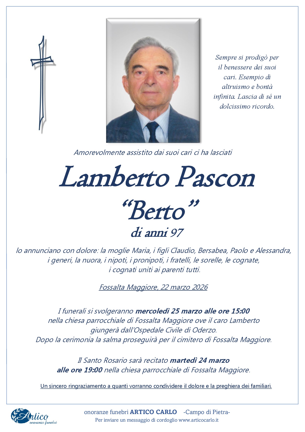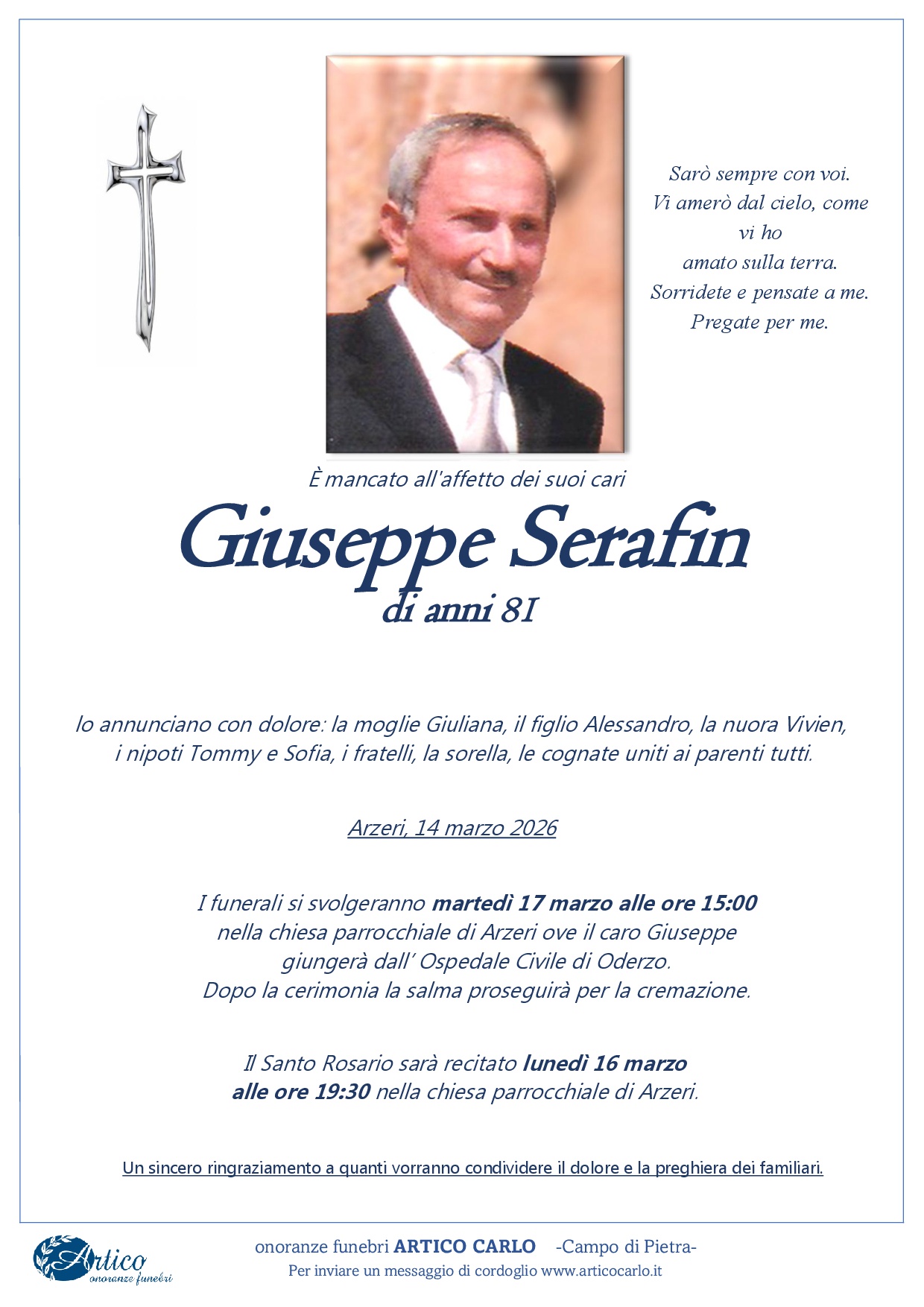 L'Impresa di Onoranze Funebri Artico é al Vostro servizio perché l’ultimo viaggio del Vostro caro avvenga nel migliore dei modi. Siamo a disposizione 24 ore su 24 ogni giorno dell’anno, non dovrete fare altro che contattarci al numero 347 0481785 e noi ci occuperemo di tutto: dal recupero della salma, all’allestimento della camera ardente, alla vestizione e al trucco del caro estinto. Ci faremo carico di espletare tutte le pratiche necessarie in base al tipo di sepoltura o cremazione da Voi richiesta. Ci occuperemo dell’addobbo floreale che eseguiremo nella nostra fioreria. Ricordate che non ci sono imprese funebri convenzionate o aderenti a ospedali, case di cura o obitori, a cui siete obbligati a rivolgervi. La scelta dell’impresa funebre è libera e nessuno può, in alcun modo, “consigliarvi” o “condizionarvi” nella scelta.